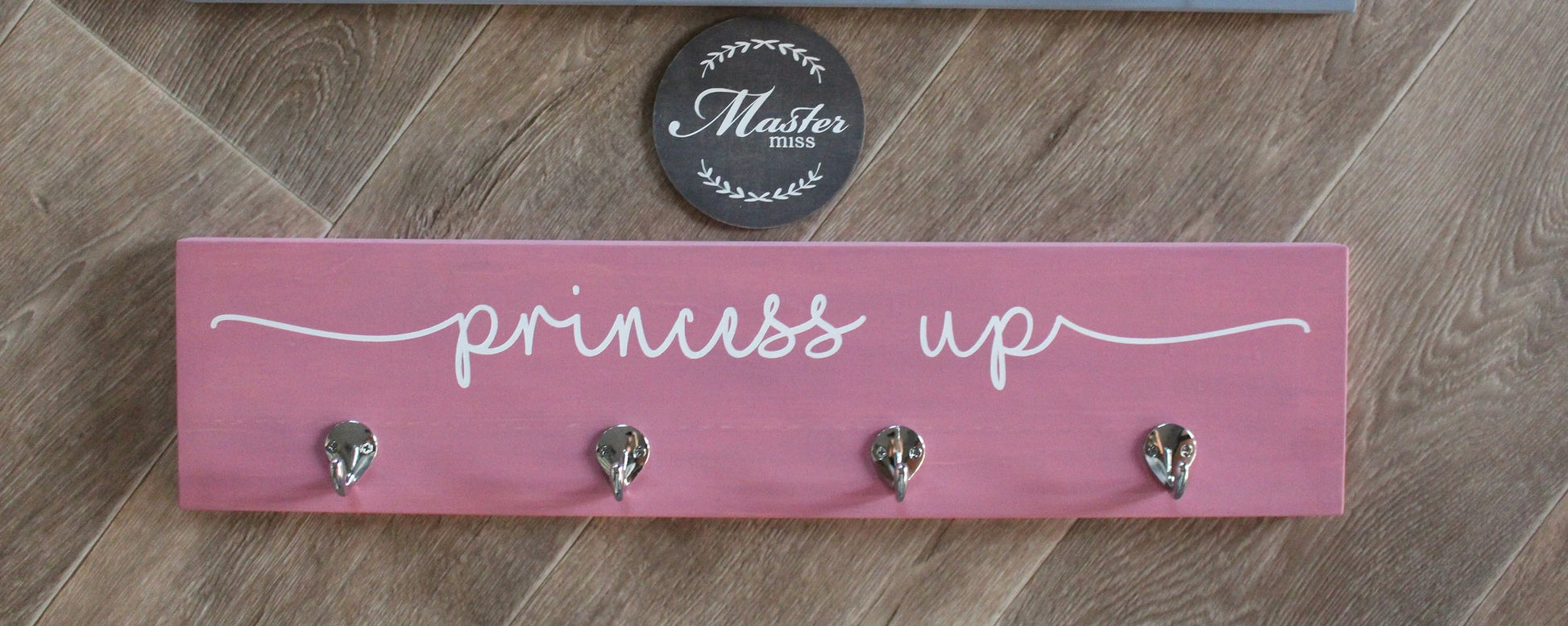 Painted pink pine timber with vinyl, sealed with a clear coat - princess up text and chrome hooks.